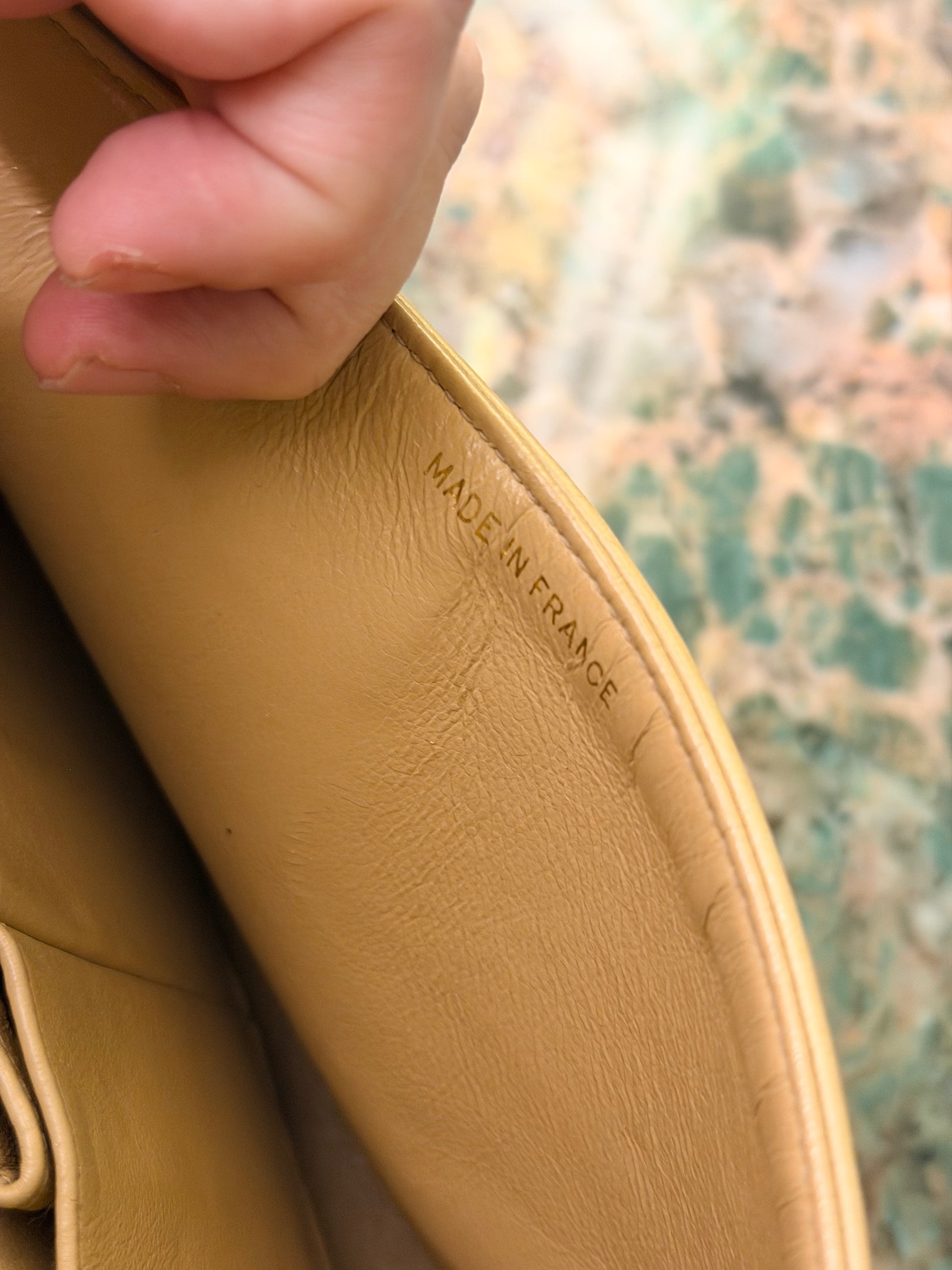 Borsa a mano o a spalla in pelle di agnello beige con metalleria placcata oro 24 carati, catena scorrevole, chiusura girevole e tasca applicata sul retro
