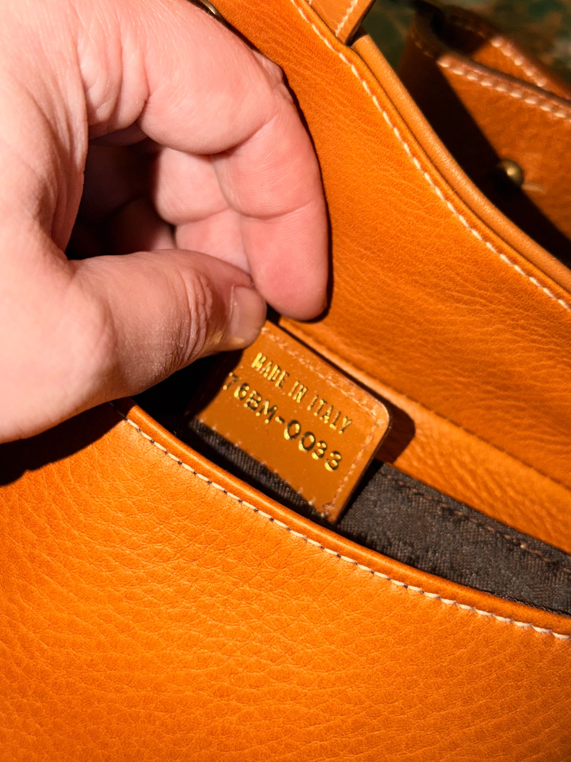 Marsupio in pelle martellata color tan con metalleria oro anticato, cintura regolabile e chiusura magnetica