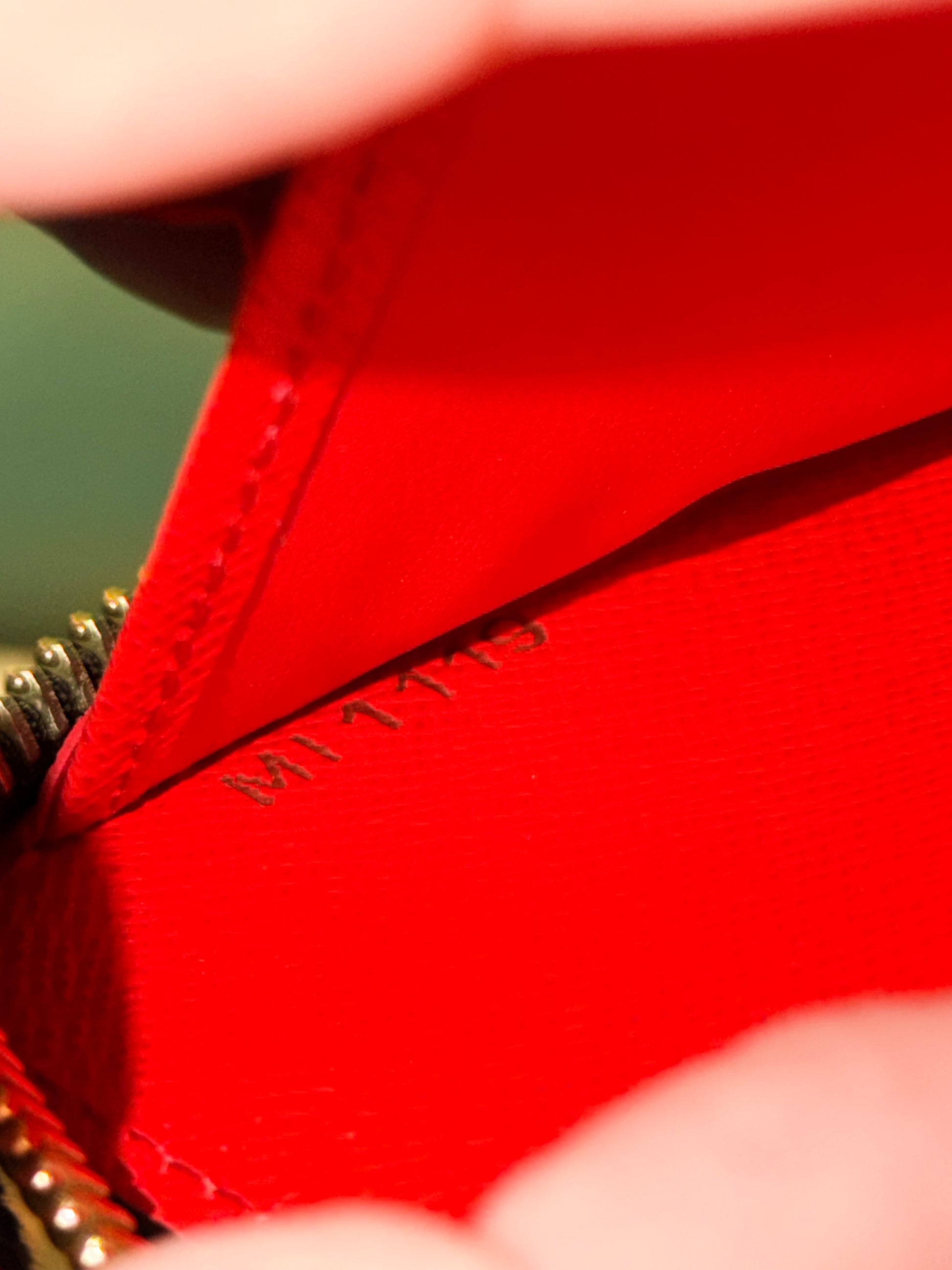Interno a soffietto in pelle rossa con tre tasche piatte, una tasca con zip e dodici slot per carte