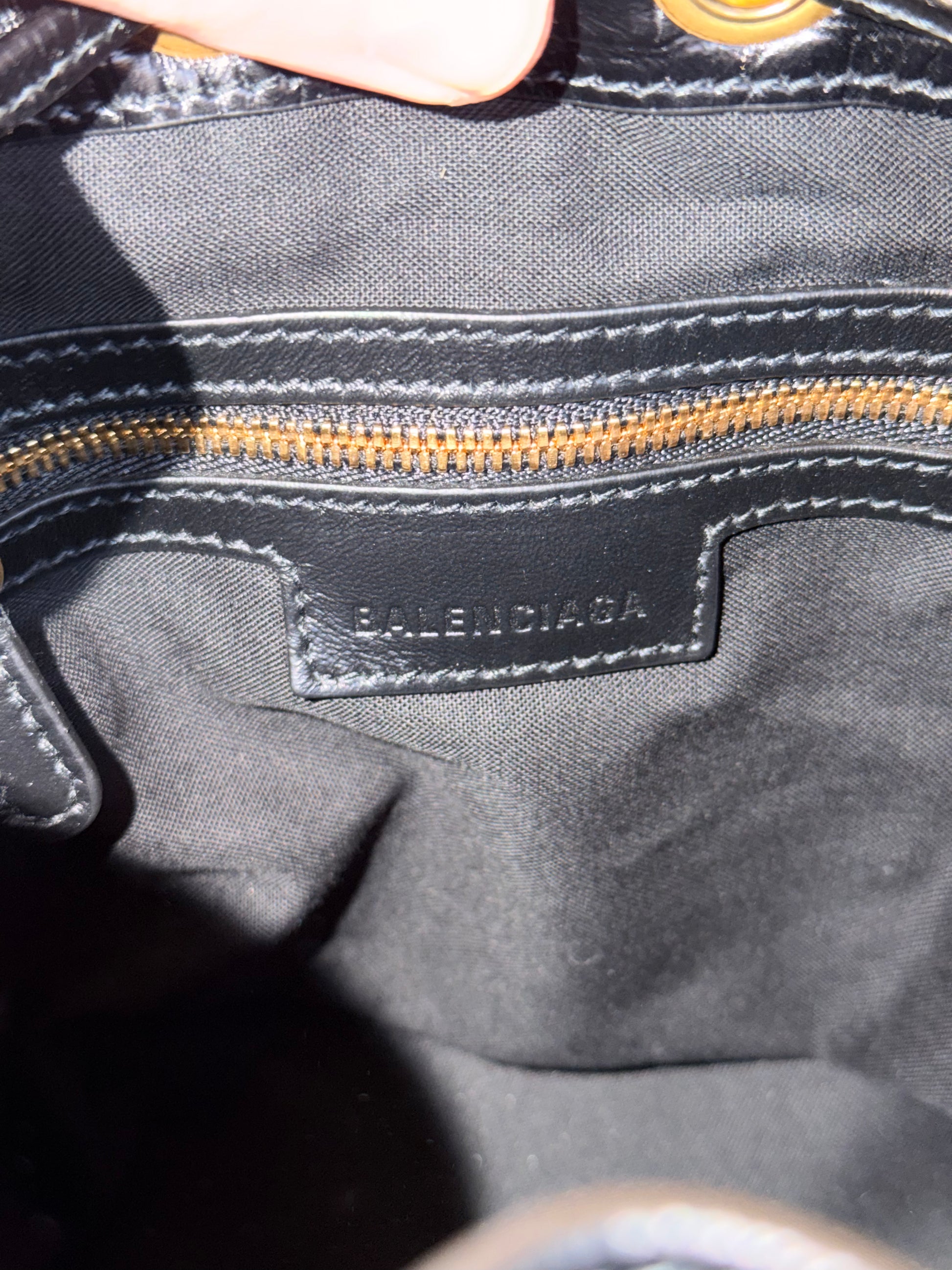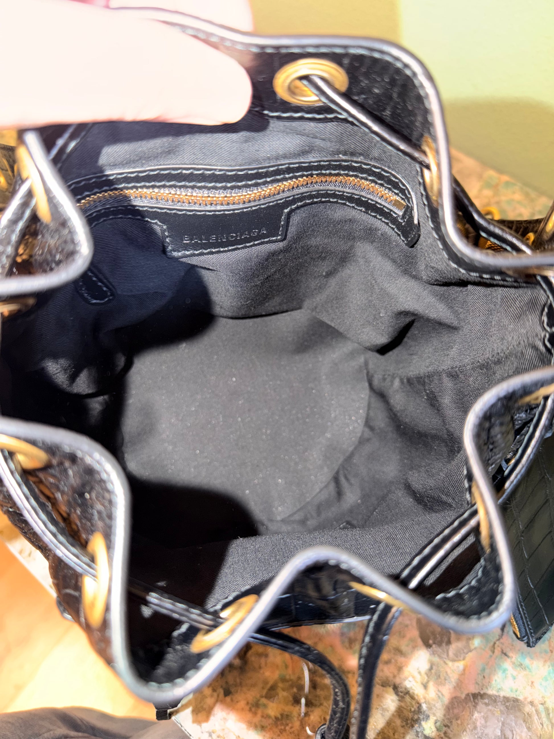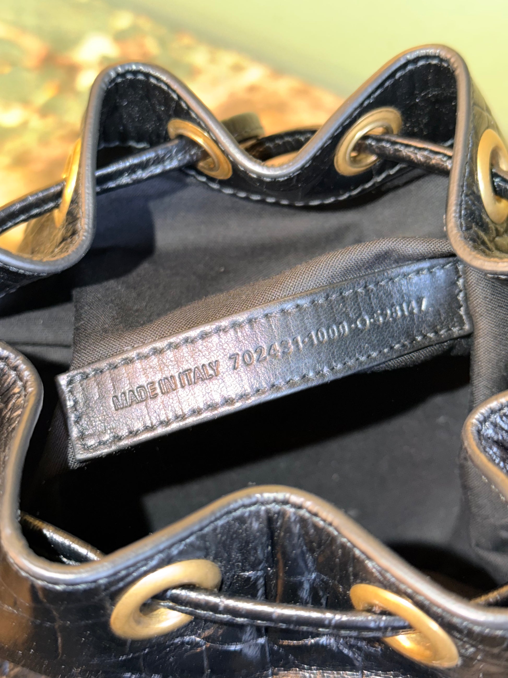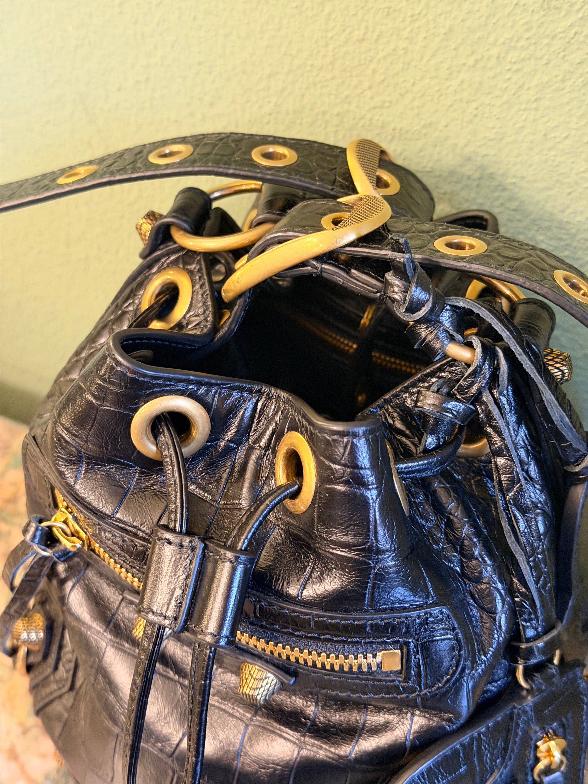 BALENCIAGA BLACK EMBOSSED CROCODILE SMALL LE CAGOLE BUCKET BAG