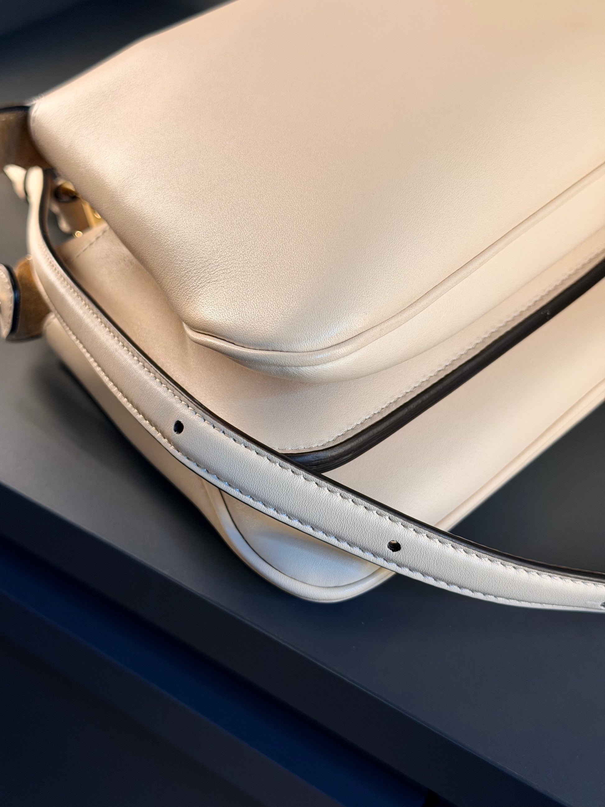 Borsa a mano o a spalla in pelle bianco gesso con metalleria oro, manico regolabile per portare la borsa sia a mano che a spalla e doppia chiusura girevole