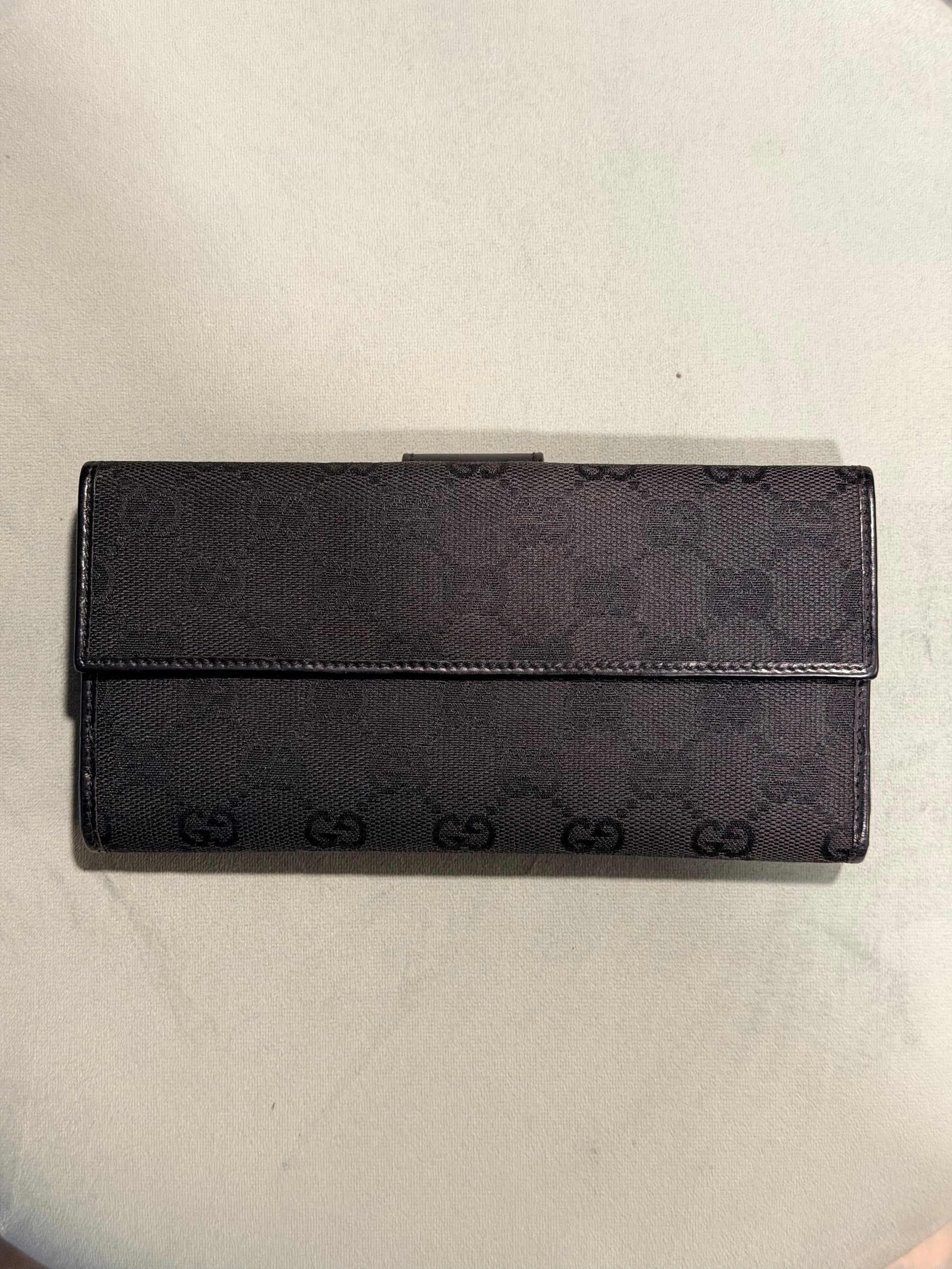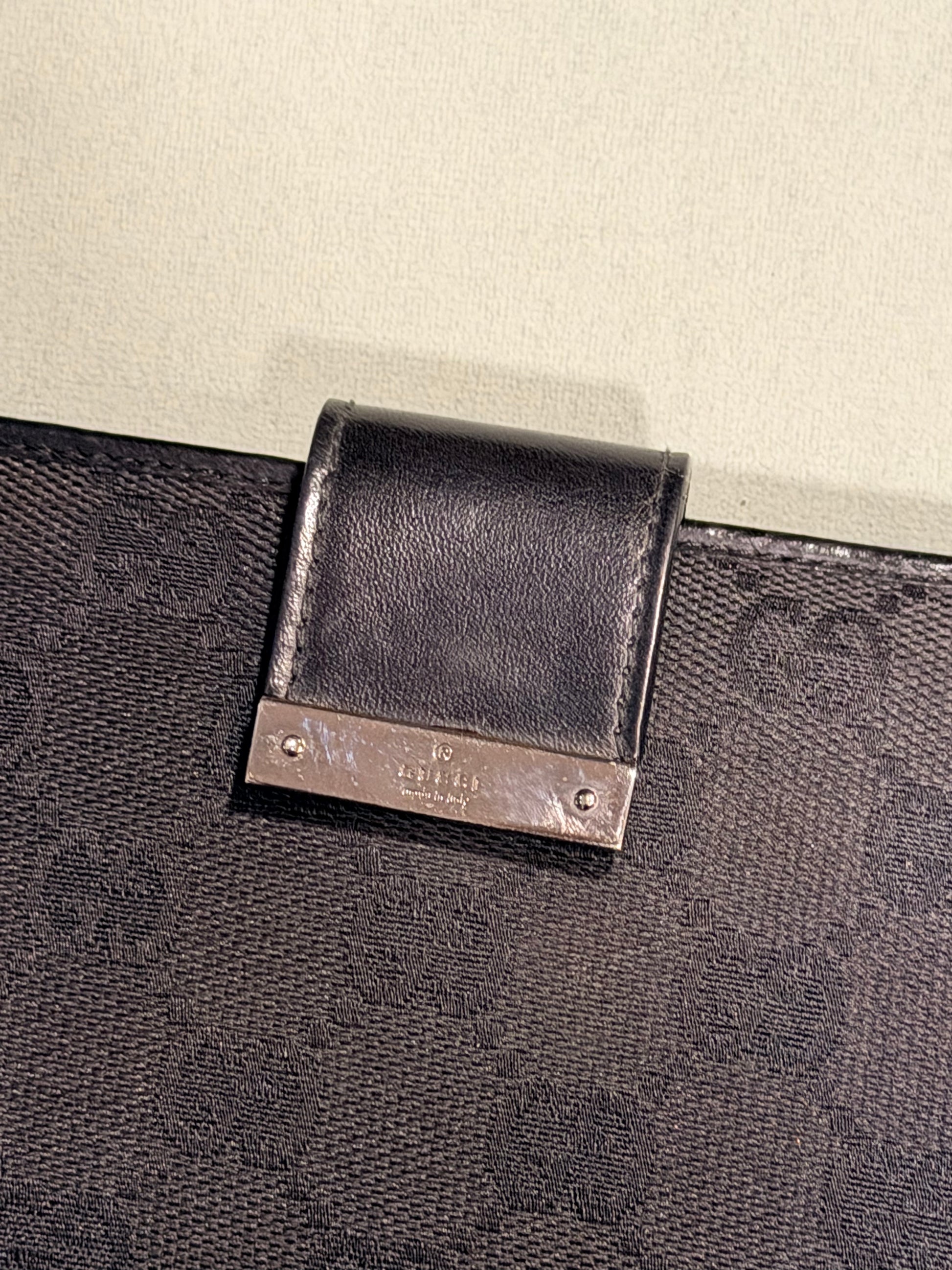 Portafoglio in tela monogram nera con dettagli in pelle, metalleria argento e due tasche proncipali con bottoni a pressione