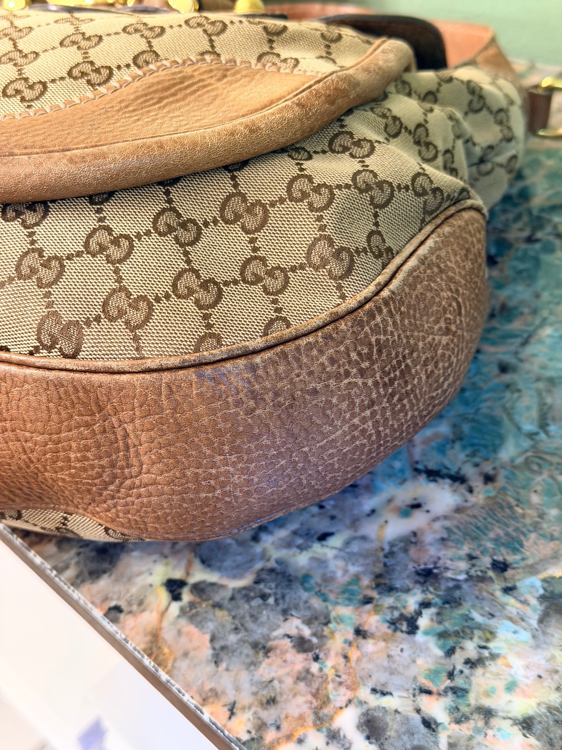 Borsa a spalla in tela monogram con manico regolabile e dettagli in pelle marrone effetto vissuto, metalleria oro e chiusura con patta. Tracolla amovibile ma non regolabile utilizzabile solamente a spalla, non a tracolla