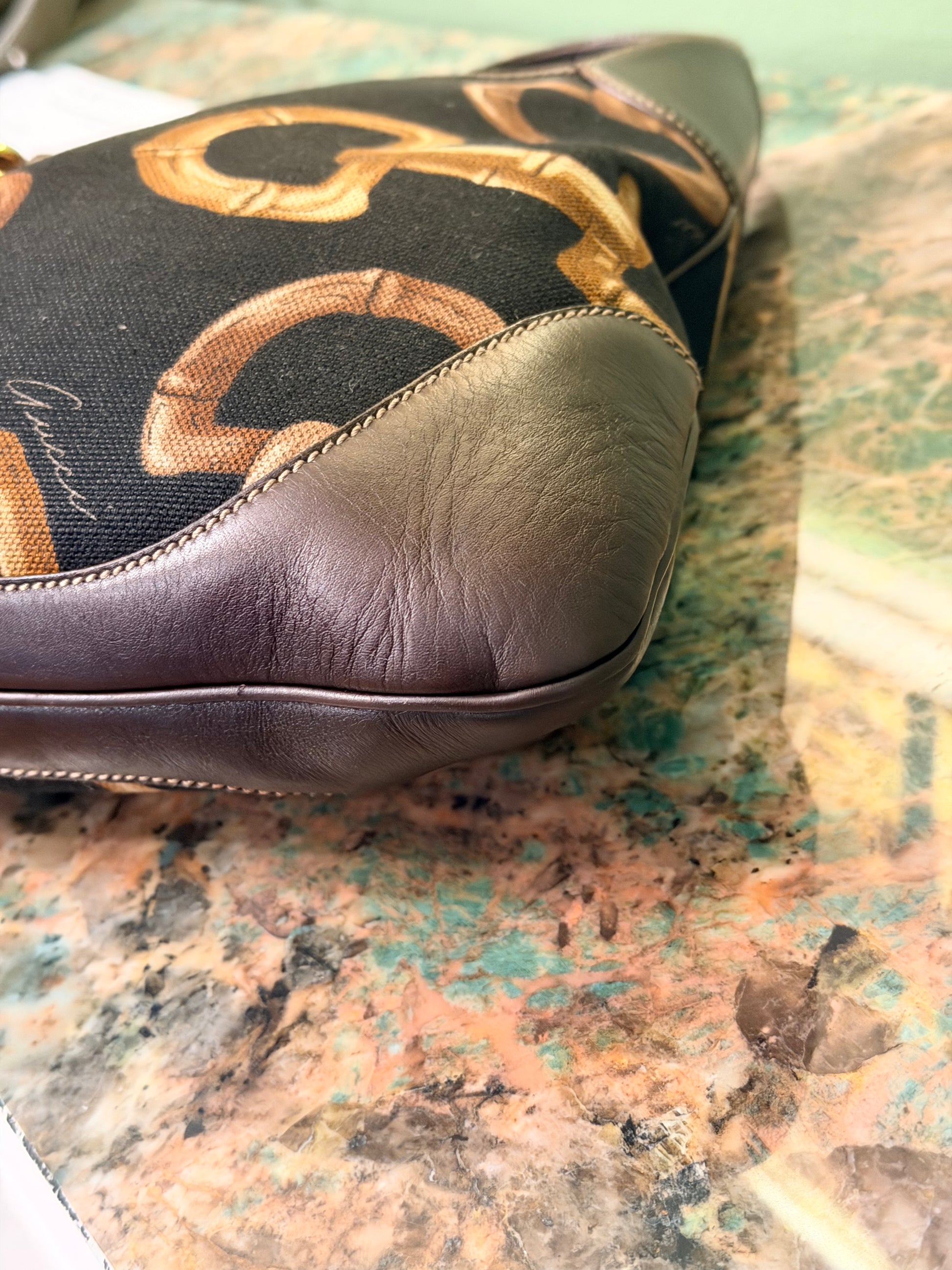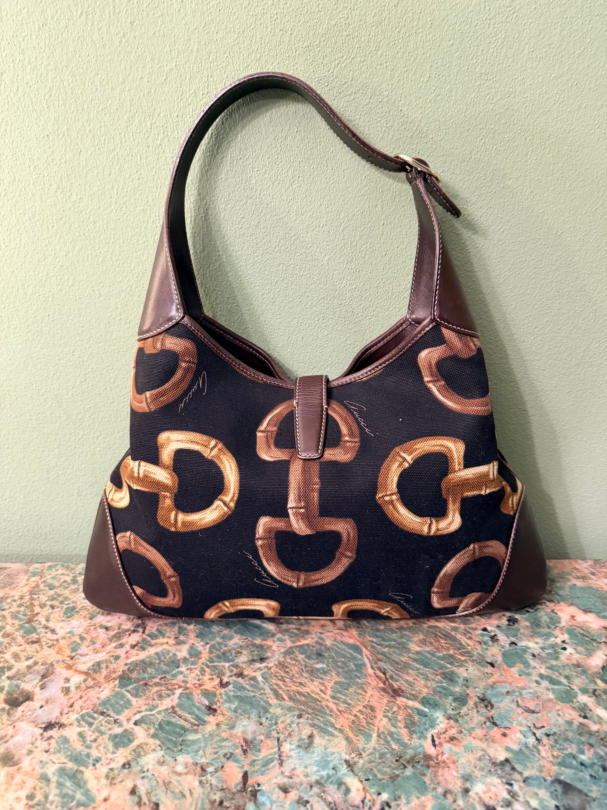 Borsa a spalla in tela con stampa horsebit su base nera, manico regolabile e dettagli in pelle marrone, metalleria oro e chiusura con moschettone