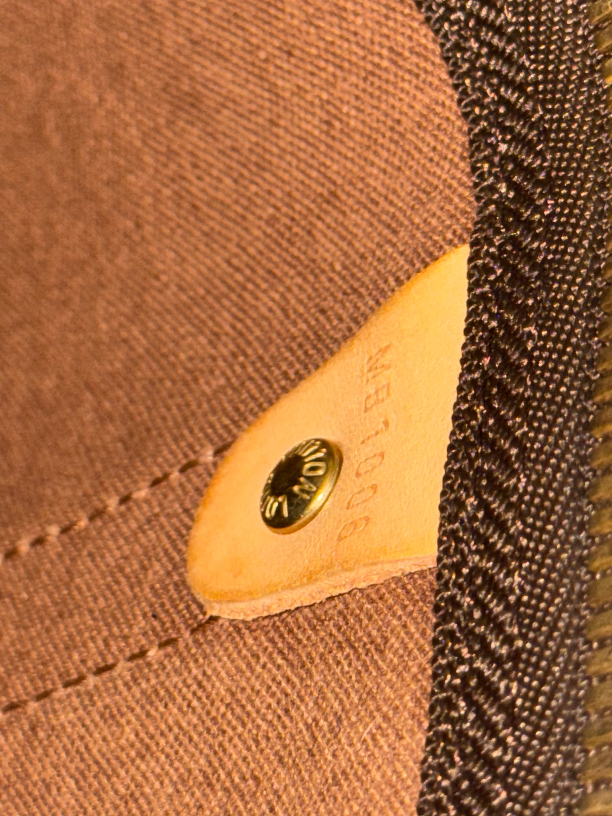 Borsa da viaggio a mano in tela monogram con manici e dettagli in vacchetta naturale, metalleria in ottone dorato e chiusura con cerniera