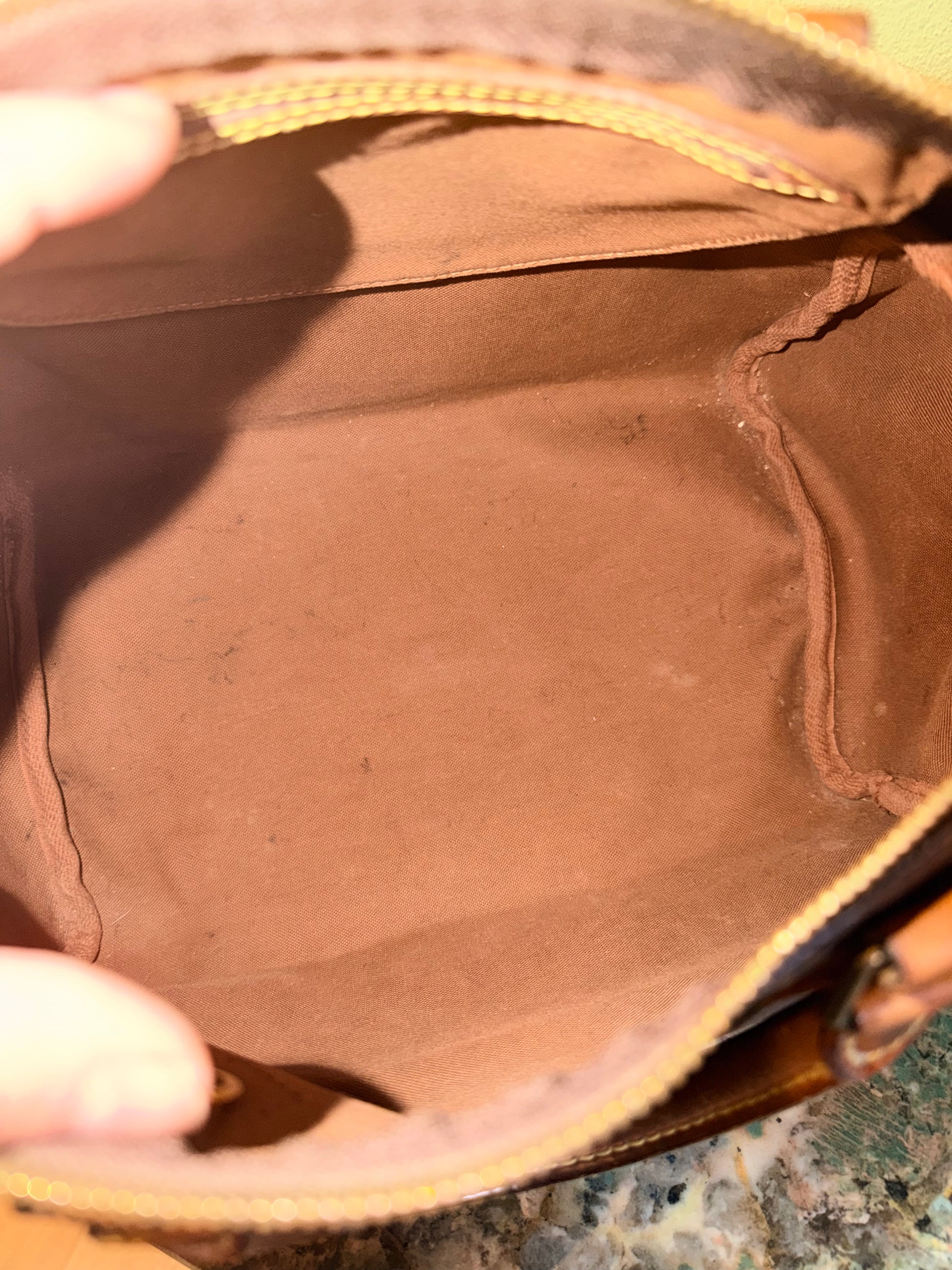 Bauletto a mano in tela monogram con manici e dettagli in vacchetta naturale, metalleria in ottone dorato e chiusura con cerniera