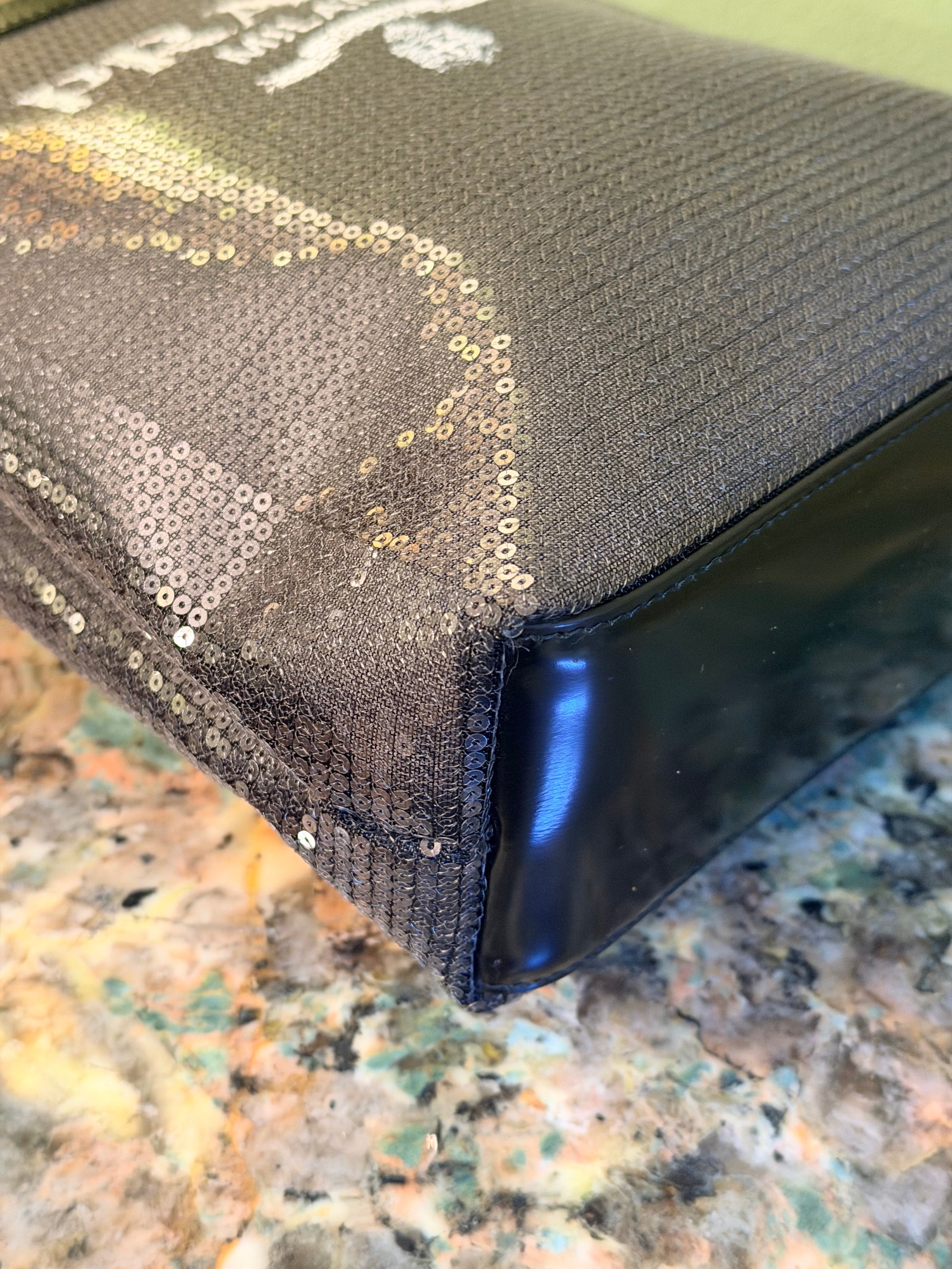 Borsa a mano in rete con paillettes, manici e dettagli in pelle spazzolata nera, metalleria argento. La borsa non ha chiusura