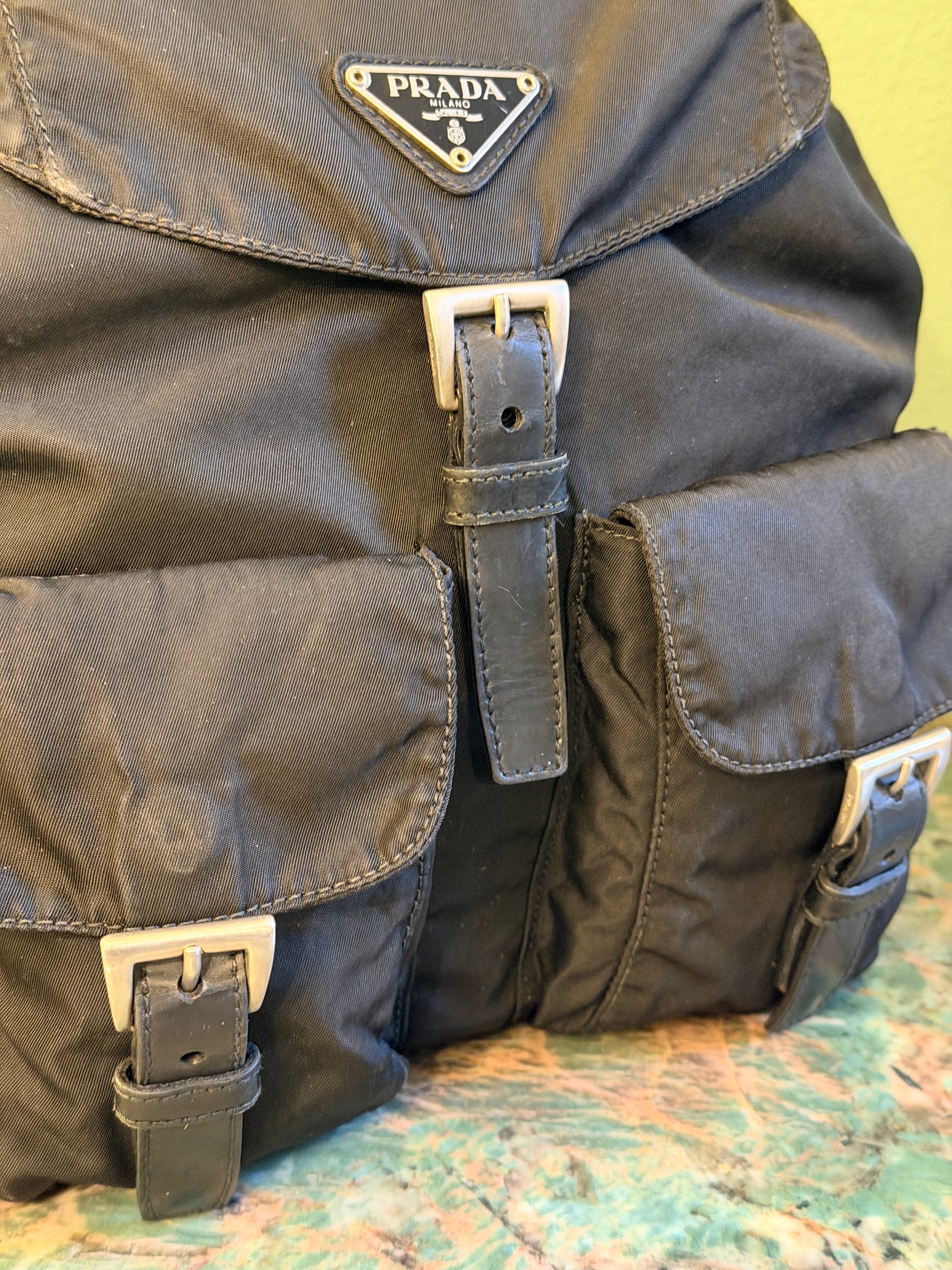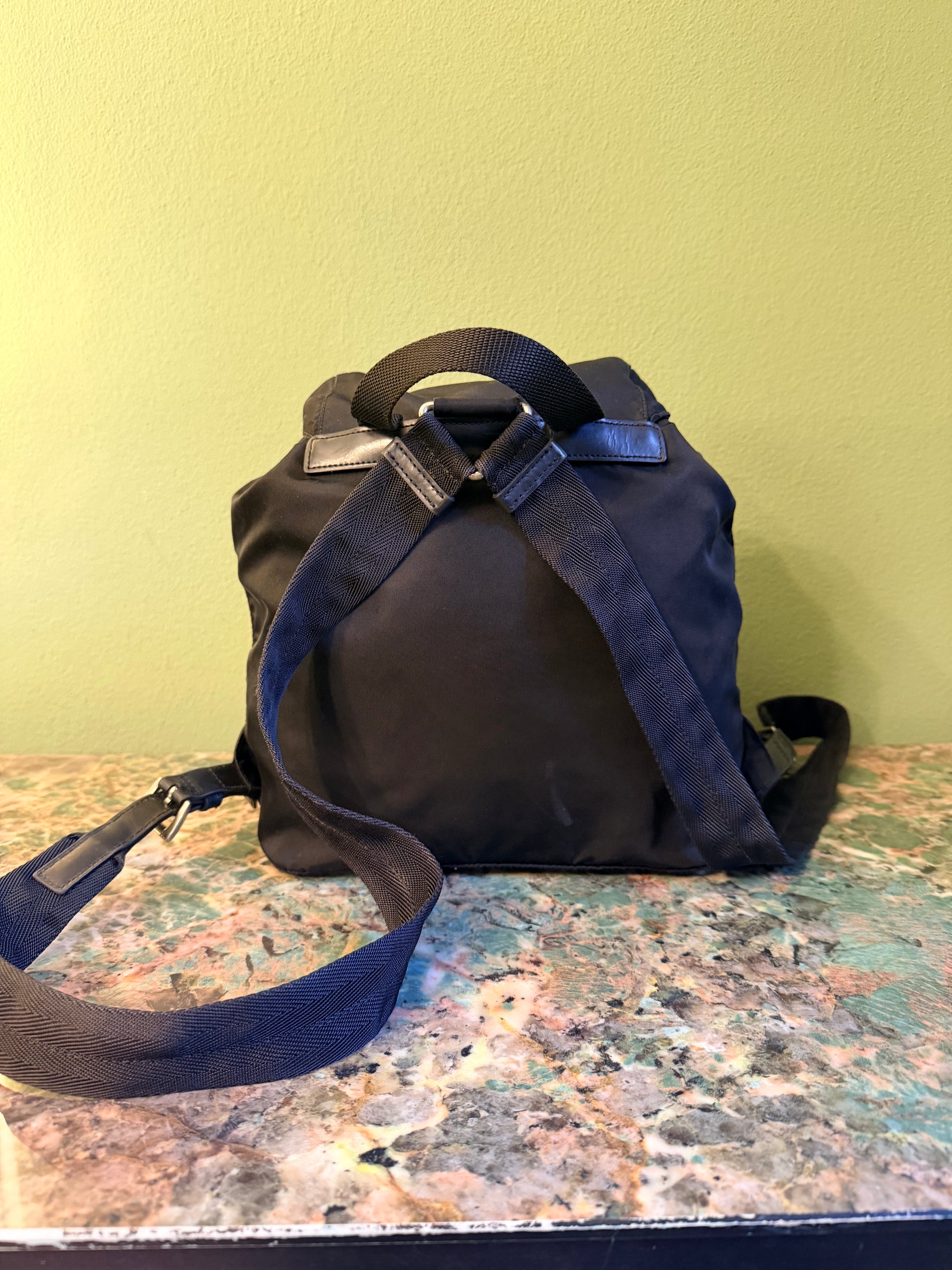 Zaino in nylon nero con dettagli in pelle, spallacci regolabili, due tasche frontali, metalleria argento e chiusura sia con coulisse che con bottone magnetico